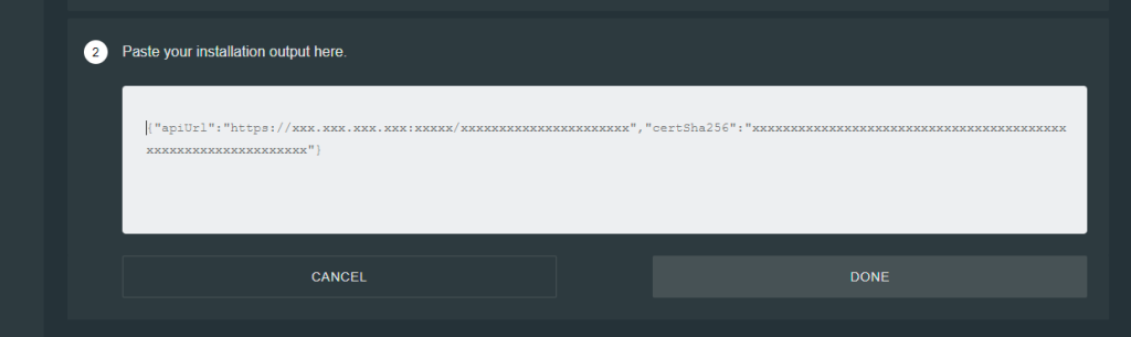 {"apiUrl":"https://IP:PORT/KEY","certSha256":"HASH"}