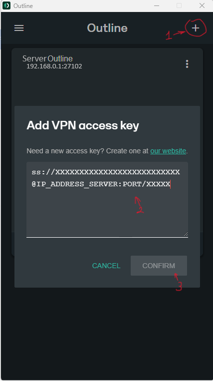 • After launching the application, click “+”, paste the copied client access key, and confirm.