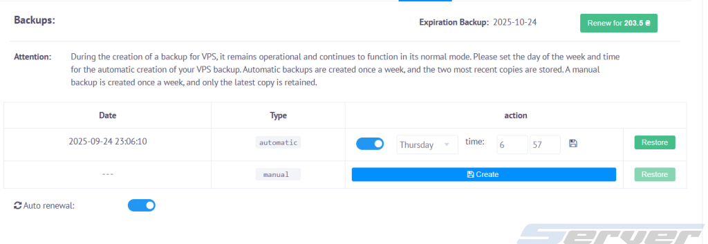 VPS Backup — це зручний інструмент, який дозволяє захистити дані вашого віртуального сервера. За його допомогою можна створювати копії системи, щоб у будь-який момент відновити VPS у разі збою чи помилки. Серед можливостей: