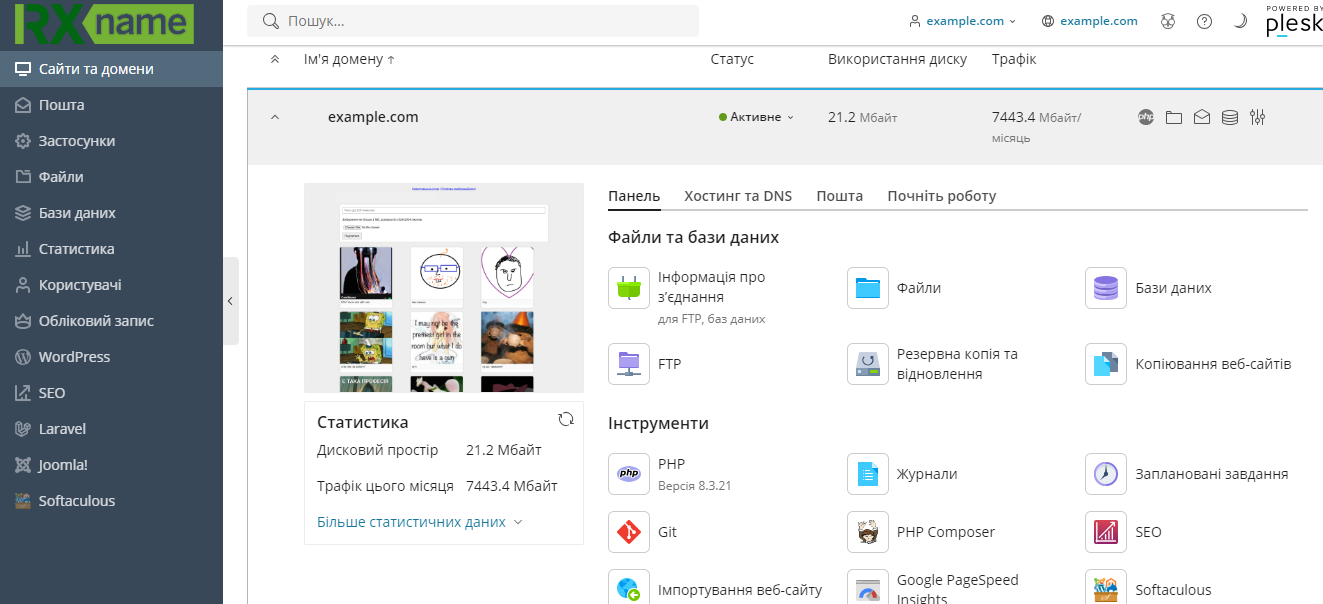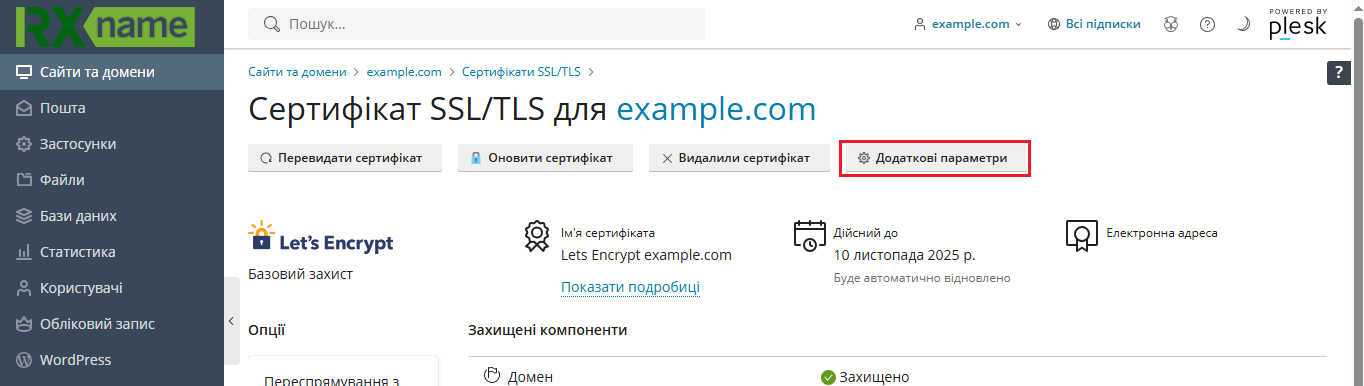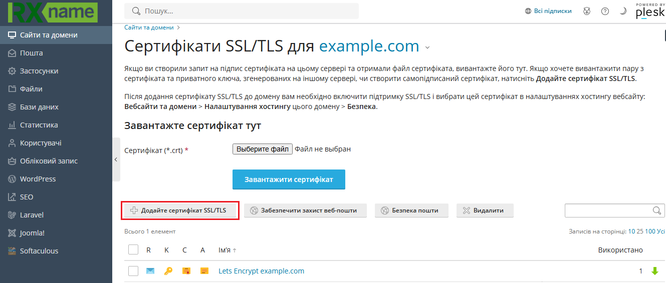 Мы рассмотрим установку стороннего сертификата на примере панели управления Plesk.