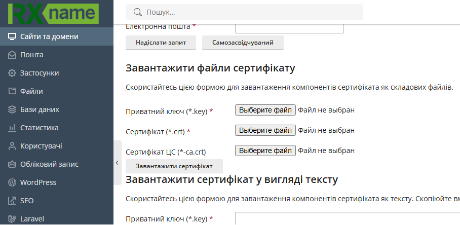 - Загрузите ваши файлы сертификатов: приватный ключ, файл сертификата и промежуточный сертификат (Сертификат CA, также известный как ca-bundle).